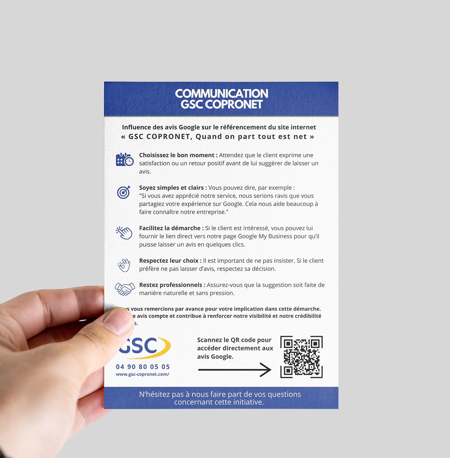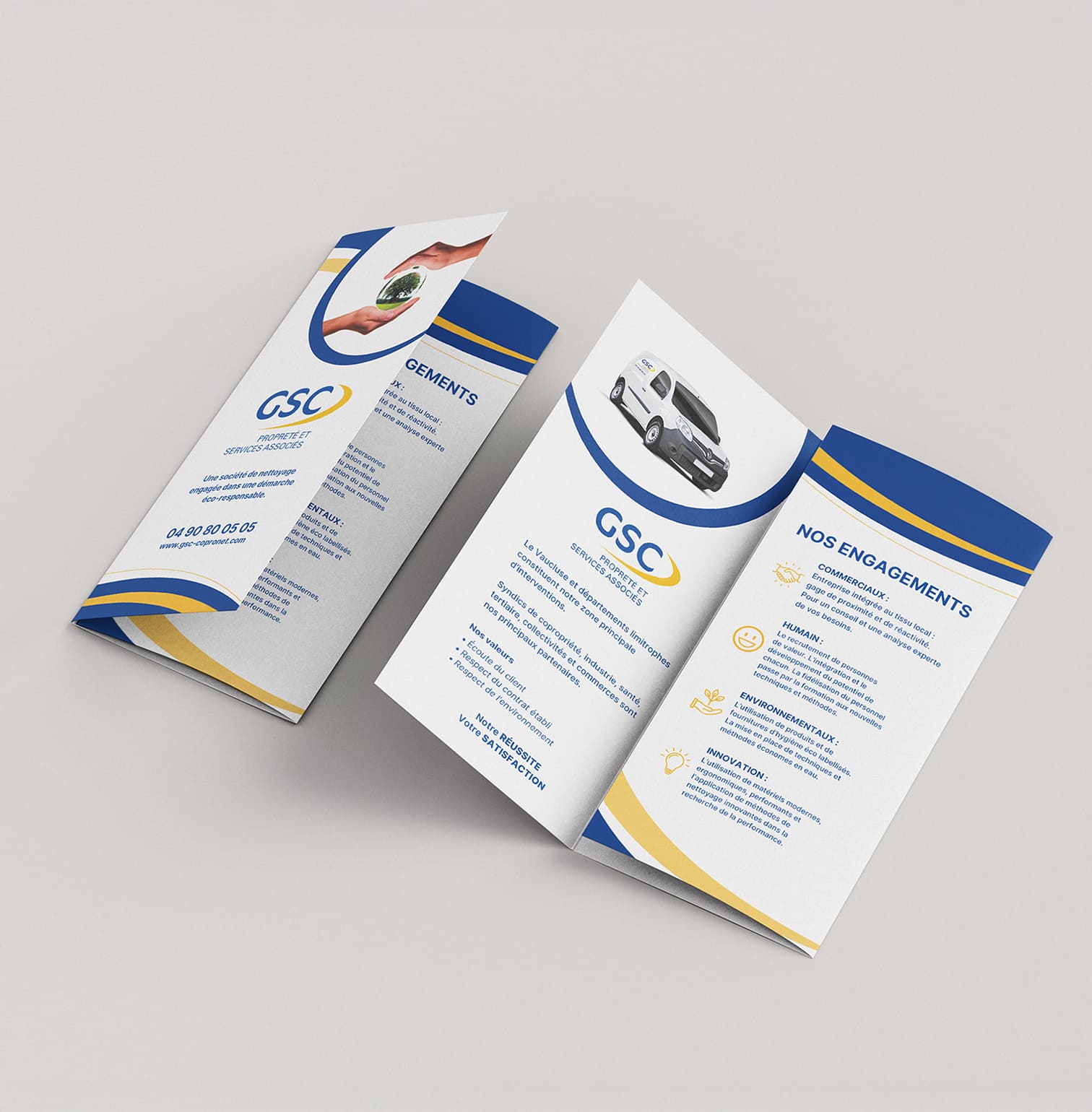 J’ai accompagné GSC Copronet en collaboration avec l’agence Com’Innov, dans le développement de sa communication visuelle à travers la création de supports print variés (dépliant 3 volets, encarts publicitaires, notes internes, etc.) et l’harmonisation des icônes du site web afin de renforcer l’unité graphique de l’ensemble.